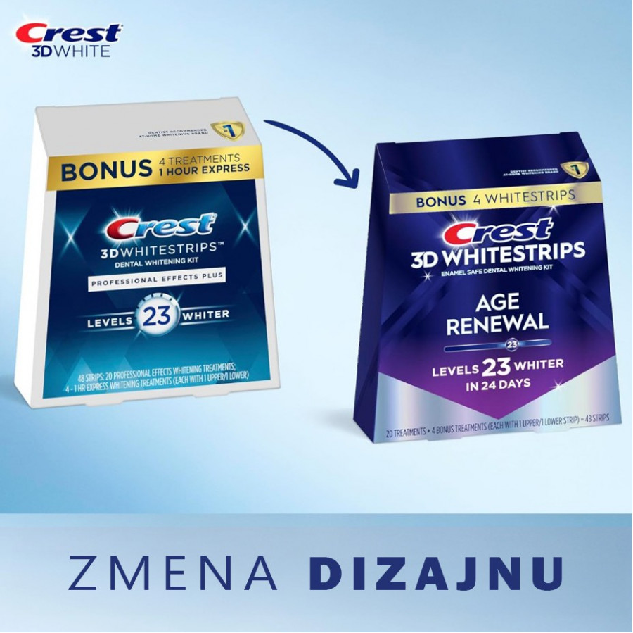Bonusové balenie bieliacich pásikov Crest 3D Whitestrips AGE RENEWAL so 4 aplikáciami pásikov naviac.