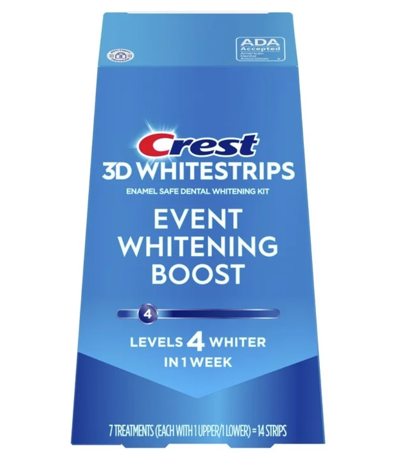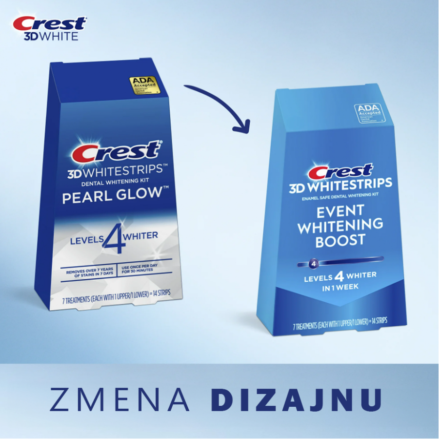 Bieliace pásiky Crest 3D Whitestrips EVENT WHITENING BOOST predstavujú základný stupeň bielenia zubov od značky Crest. Po ich použití budete mať zuby viditeľne belšie o 4 odtiene.