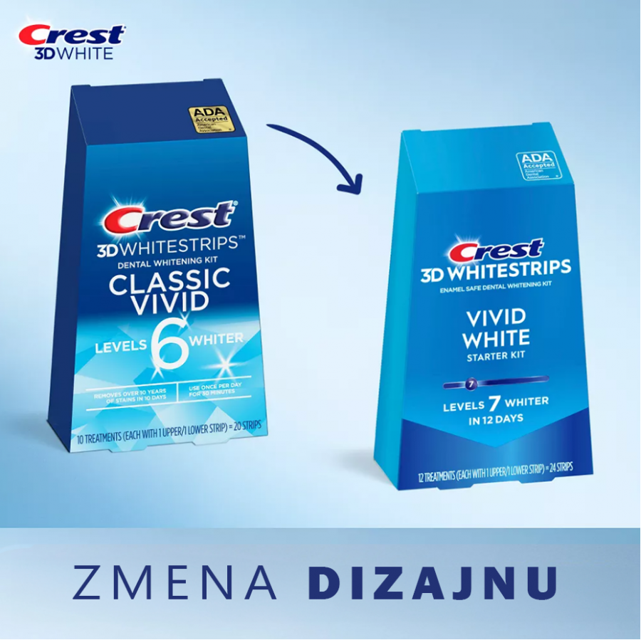 Bieliace pásiky Crest 3D Whitestrips VIVID WHITE predstavujú základný stupeň bielenia zubov od značky Crest. Po ich použití budete mať zuby viditeľne belšie. Niektorým ľuďom môžu vybieliť zuby na skutočne snehovobielu farbu, ale niektorým len na základný nižší stupeň bielenia, keďže sú to slabšie pásiky ako ostatné z rady Crest 3D White. Cenovo sa však naozaj oplatia, pretože za takúto cenu, a dokonca aj za vyššiu, sa bežne na slovenskom trhu predávajú úplne neúčinné produkty.
