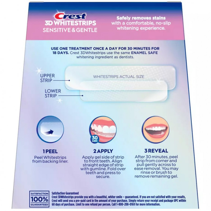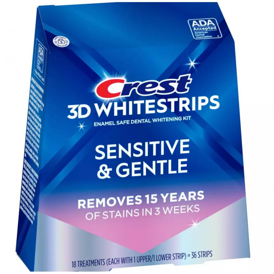 Bieliace pásiky na citlivé zuby Crest Whitestrips SENSITIVE & GENTLE sú vyvinuté špeciálne pre ľudí s citlivými zubami, alebo citlivými zubnými kŕčkami. Bielenie prebieha postupne a veľmi šetrne, ale zároveň aj efektívne. Tieto pásiky dokážu zo zubov odstrániť zafarbenia, ktoré sú staré aj 15 rokov. Zuby sú po predpísanej dobe používania biele a žiarivé.