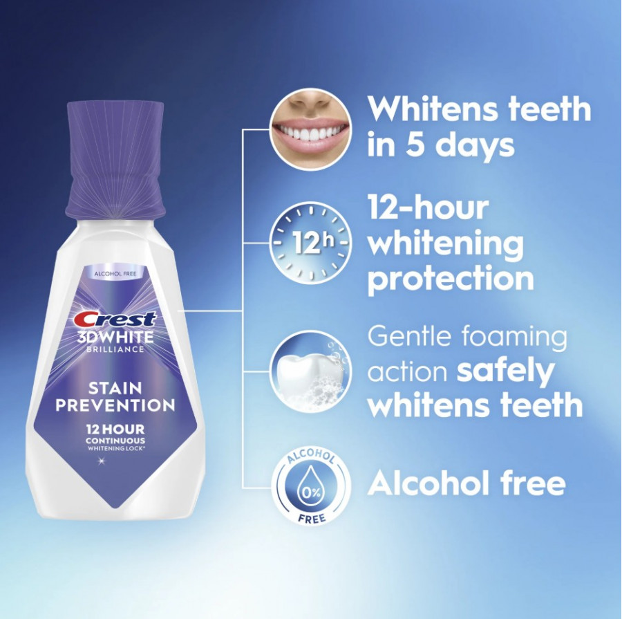 Objavte žiarivejší úsmev s ústnou vodou Crest 3D White Brilliance. Vďaka exkluzívnej technológii Whitening Lock pôsobí ako ochranný štít, ktorý zabraňuje tvorbe nových škvŕn až na 12 hodín. Už po 5 dňoch používania bude váš úsmev belší a budete pociťovať príjemne svieži pocit v ústach.